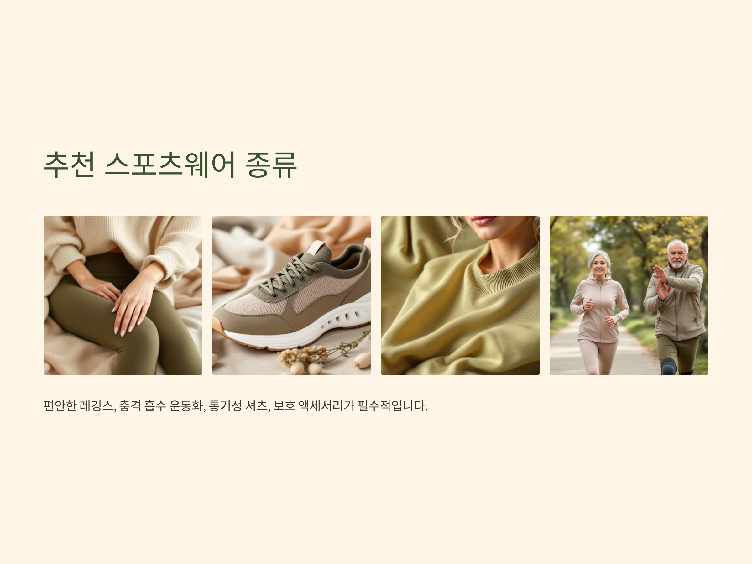 80대 스포츠웨어는 편안함, 안전성, 스타일을 모두 고려해야 합니다. 나이에 맞는 스포츠웨어는 신체적인 특성과 피부 상태를 반영하여 선택하는 것이 가장 중요합니다. 운동복은 단순히 기능성만 고려하는 것이 아니라, 착용자의 스타일과 취향에 맞춰 선택할 수 있어야 하며, 편안하고 안전한 운동을 위해 꼭 필요한 요소들을 잘 챙기는 것이 중요합니다.