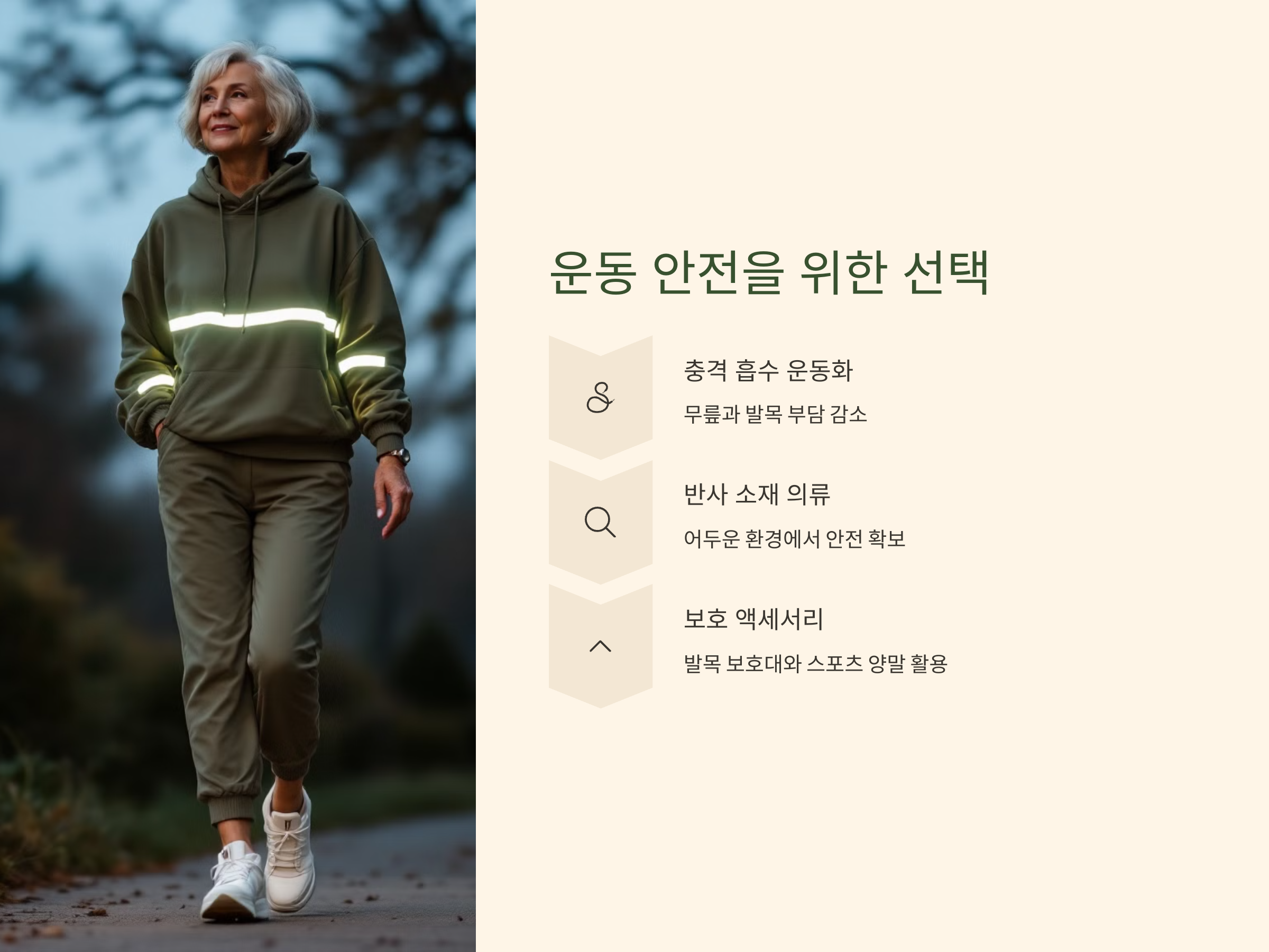 운동복의 경우에도 안전을 고려해 반사 소재가 포함된 제품을 선택하는 것이 좋습니다. 어두운 환경에서 운동할 때, 반사 소재가 포함된 의류나 액세서리는 운전자의 시선을 끌어주어 사고를 예방하는 데 도움을 줍니다. 또한, 발목을 보호할 수 있는 스포츠 양말이나 보호대를 함께 사용하는 것도 좋은 방법입니다.